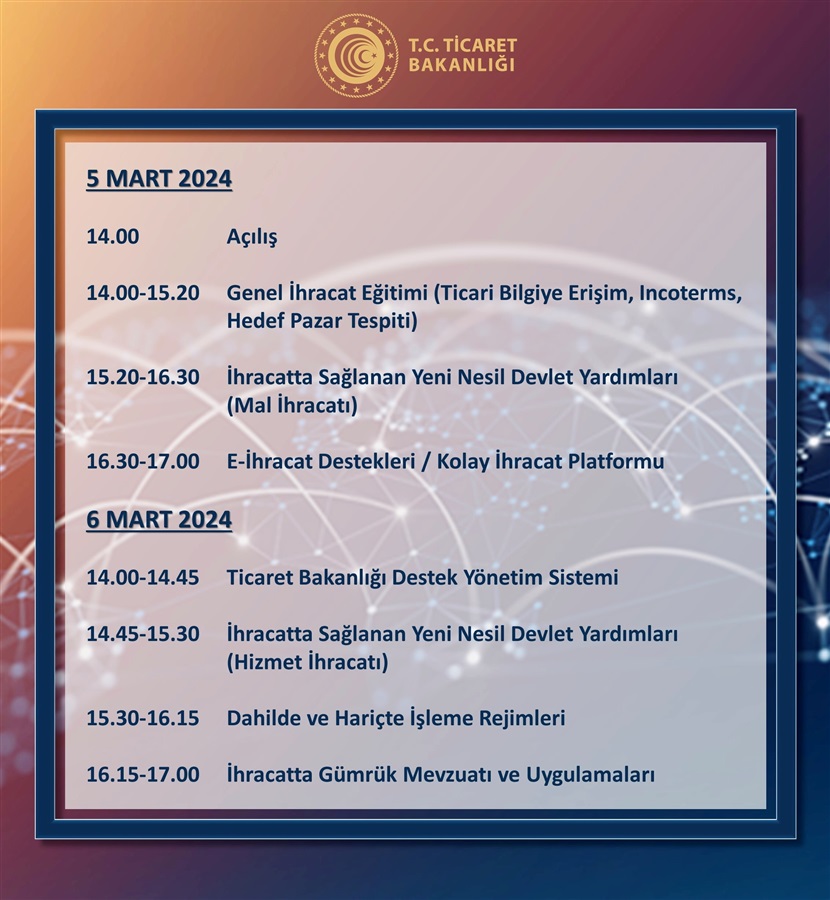 TOBB’dan alınan yazıda Ticaret Bakanlığı’nca 5-6-7 Mart 2024 tarihlerinde “Ticaret Bakanlığı İhracat Süreçleri ve Devlet Destekleri Eğitim Programı” çevrimiçi olarak düzenleneceği belirtilmektedir.