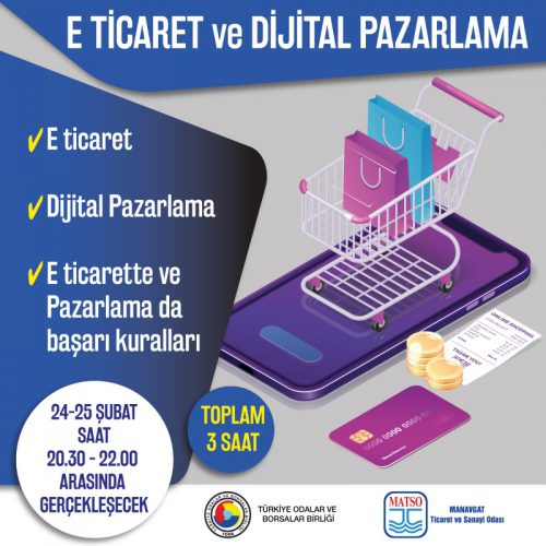Manavgat Ticaret ve Sanayi Odası (MATSO) 24-25 Şubat tarihlerinde 20.30-22.00 saatleri arasında pandemi döneminde önemi daha da artan E-Ticaret ve Dijital Pazarlama eğitimi düzenliyor. Online olarak Zoom  Webinar üzerinden gerçekleşecek eğitim Türkiye Odalar ve Borsalar Birliği (TOBB) Ekonomi ve Teknoloji Üniversitesi öğretim Görevlisi Serdar Bilecen tarafından verilecek.
